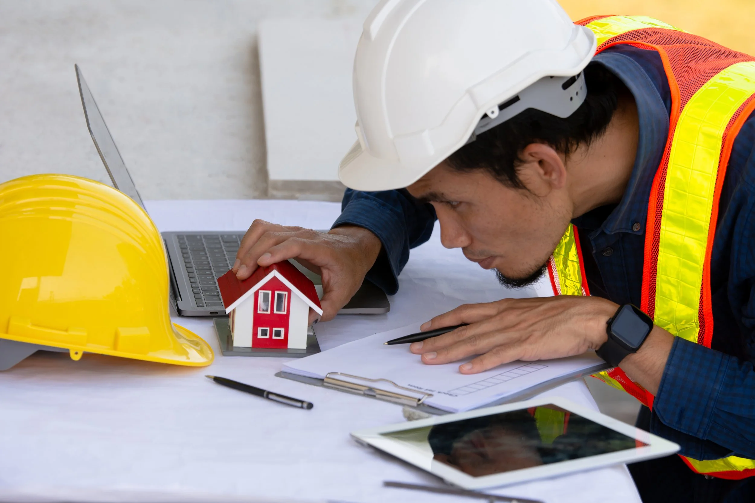 A construction worker wearing a white safety helmet and yellow vest working at a desk with a yellow helmet, a small model house, a laptop, a tablet, and various papers and pens.